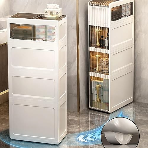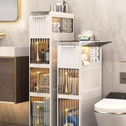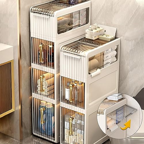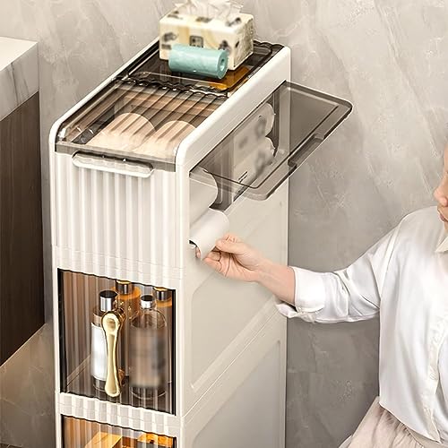 - 5. Sufficient Storage Capacity: This toilet side storage cabinet can be stored in every place.The top opening and groove design can place toilet paper and dental cups.Layered drawers can store towels,cosmetics,and toiletries by category.