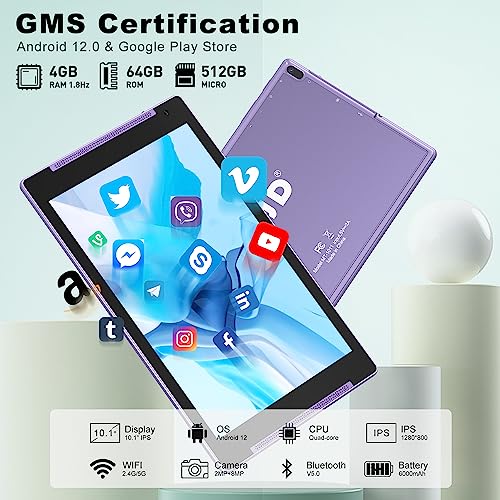 10.1 inch Tablet, Android 12 Tablets, 4GB RAM,64GB ROM(512GB Expandable), HD IPS Screen,2MP Front Camera,8MP Rear Camera,Wi-Fi, Bluetooth 5.0, 60