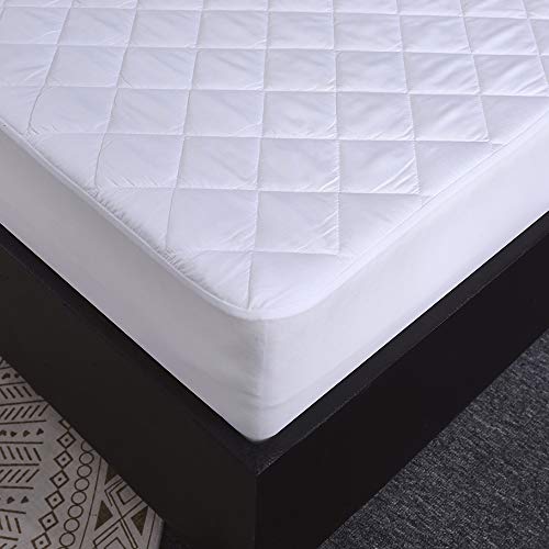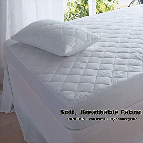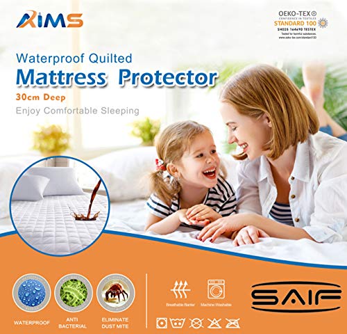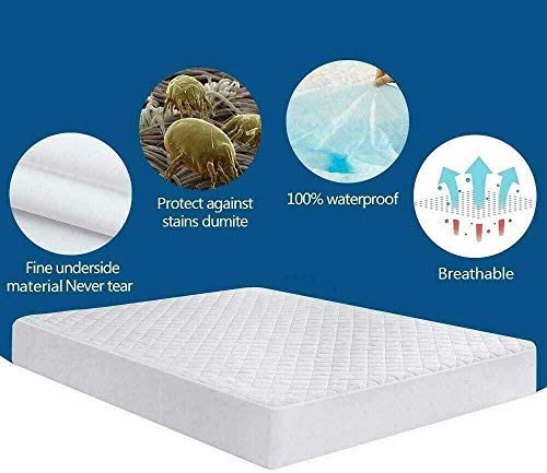 Product Description 100% Waterproof Quilted Mattress Protector Cover 100% Waterproof Quilted Mattress Protector Cover Microfiber Quilted Topper Fitted Sheet, Anti Allergy & Breathable Elasticated Side Skirts Machine Washable Easy Care 30cm Deep (4FT (120x190+30)cm) Topper Fitted Sheet Anti Allergy & Breathable Elasticated Side Skirts Waterproof 30cm deep and highly breathable mattress protector. Fitted Sheet cover, the polyurethane membrane perfectly blocks all fluids, sweat, urine and bodily fluids, while letting the mattress breathe.Soft and hypoallergenic. the waterproof fitted sheet is 100% Microfiber on the sleeper’s side and its thinness allows your baby to fully experience the softness of his/her mattress. Ideal for Home, Hotels, Hospitals, Day Care Centres, Old People Homes, Care Homes, Nurseries.This mattress protector has elasticised side skirts, which wrap around the mattress for a firm fit. Can be used for all types of mattresses. Fits up to 30cm deep mattress.Total protection against common allergens. The ground breaking Bi-Ome treatment creates a complete protection against dust mites, bacteria, mould and pollen - Perfect for children suffering from allergies. Single 90x190+30cm S/D – 4FT 120x190+30cm.Double 140x190+30cm. King 155x200+30cm. S-King 185x200+30cm.Machine washable at 30°C with similar colours. Low-temperature drying. Do Not Bleach, Do Not Iron.