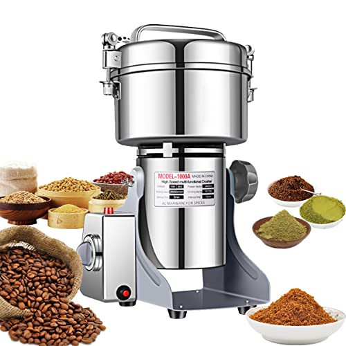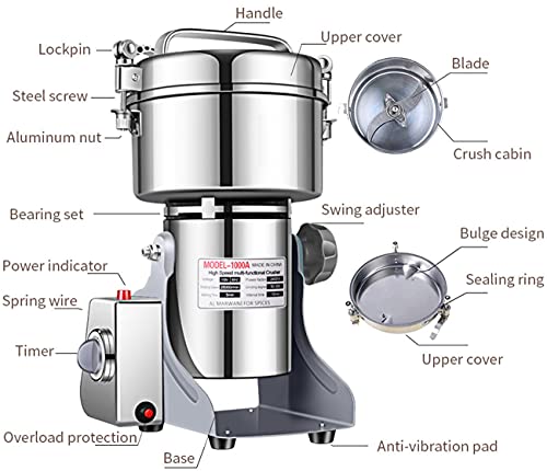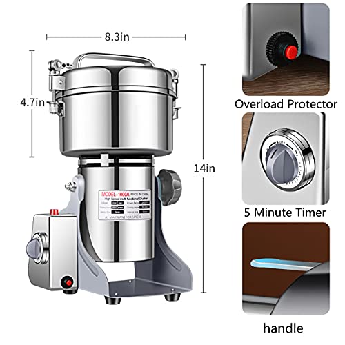 1000g Electric Grain Grinder Spice Grain Mill Stainless Steel 30s 25000RPM High Speedy Grinding with Overload Protection& 5min Timer Mill for Dry