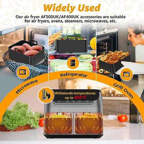 - [Wide Application] This air fryer AF300UK/AF400UK accessories set is suitable for air fryers, ovens, steamers, microwaves, etc. Perfect for baking, cooking, making French fries, onion rings, kebabs, chicken strips, roasted vegetables, grilled chicken, etc. Prepare delicious food for home, camping, party, etc.
