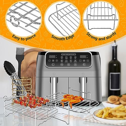 - [11Pcs Air Fryer Accessories Set] This package contains 2 × Air Fryer Silicone liners, 4 x Metal Skewers, 2 × Air Fryer Racks, 1× Oil Brush,1× Food Tong and 1× Air Fryer Cooking Time Chart. With sufficient different air fryer accessories, it will be more convenient and time-saving to cook and bake and make multiple dishes at the same time.