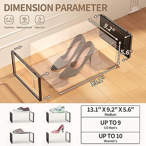 - 🛒【 Large Size Shoe Box】 Upgraded wider and higher shoe organizer fit for larger shoes size . Unit size is 13.1 "(L) x 10 "(W) x 6 "(H), fits for women’s shoes up to US size 12 and men’s shoes up to US size 11. Suitable for many types of shoes such as heels, flats, sneakers, leather shoes, sandals, wedges, and others shoes.
