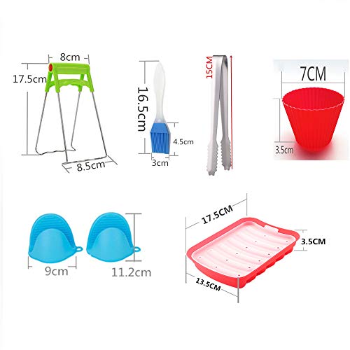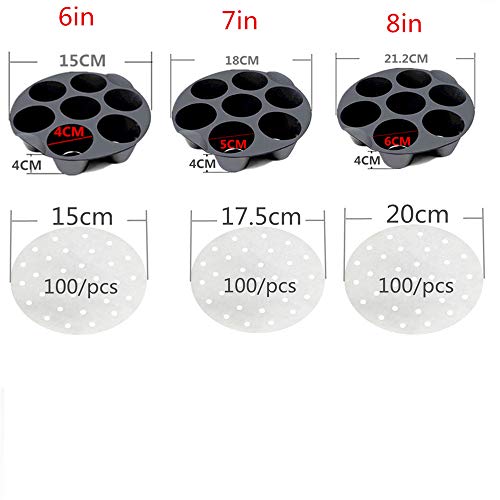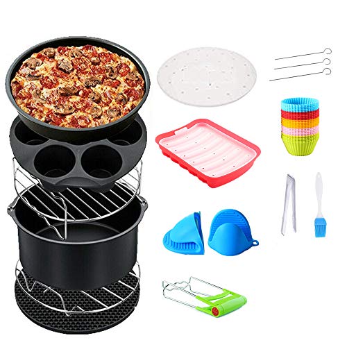 - 【 13 Sets Air Fryer Accessories】With FDA-approved 6 inch air fryer accessory set, 1x cake barrel, 1x pizza pan, 1x silicone mat, 1x metal holder, 1x skewer holder, 1x bread holder, 1x eggshell, 1x anti-hot bowl clip, 1x oil brush, 1x silicone food tong, 100x air fryer liners, 1x bowl mat, 1x gloves. Meet all your cooking needs for home use.