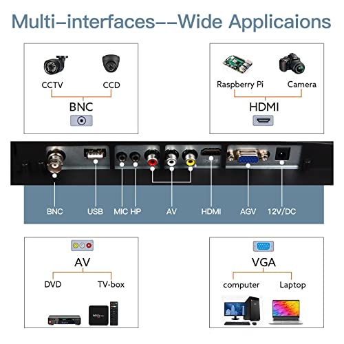 - 【Support multiple video input interfaces】 The monitor has BNC/VGA/HDMI/AV/USB interface and audio output and input.BNC for CCTV surveillance system; multimedia playback of movies and photos by connecting to a USB stick; HDMI to improve picture quality or for games; VGA for PC monitors, working as a second display when handling documents or distributing displays; AV input for rear view camera or DVD,VCR.
