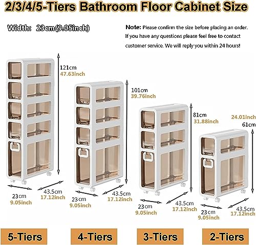 - 【Large storage space】The narrow storage cabinet is equipped with multiple layers of semi transparent plastic drawers,allowing you to organize different items,such as cosmetics,toiletries,towels,toilet paper.The unique raised design at the bottom allows for the placement of large bottles of washing liquid or shower gel,making it the perfect choice for cleaning up bathroom clutter.