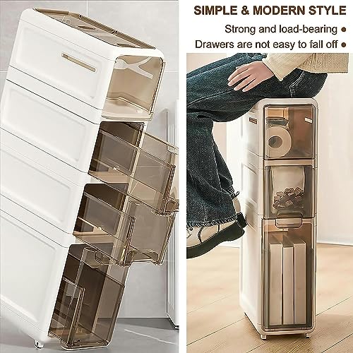 • 【Small volume】A vertical storage unit with 4 drawers is suitable for narrow spaces and gaps,and can easily slide into the narrow gaps between the refrigerator and the wall or between the washing machine and the toilet.The white thin storage drawer tower will add an elegant and luxurious feeling to your room