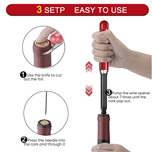 - 【Efficient & Convenient】The newest design air pressure wine bottle opener is simple, convenient and light weight. When used, just puncture the wine cork with the needle, hold the handle and draw air up and down for 3-7 times to take out the cork without destroying the cork and the bottle, nor producing wood cutting. It is clean and sanitary, and can be used for many times after cleaning.