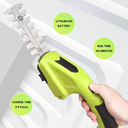 - 【 2 in 1 Cordless Hedge Trimmer 】 This 2-in-1 wireless hedge trimmer is the ideal solution to meet your gardening needs. It has a 7.2V lithium-ion battery with a running time of 40 minutes and a charging time of only 3-5 hours. When you choose the appropriate hedge trimmer, whether you want to cut your home's vegetation into flat, sloping, or spherical shapes, this hedge trimmer can achieve twice the result with half the effort.
