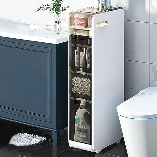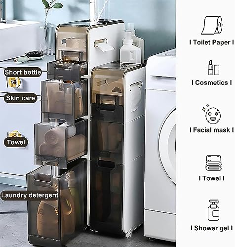 • ● Narrow and small design: Our narrow bathroom storage are suitable for any place in your home. The small size 6.9 “W x 16” D x 23.3 “H can be placed in any narrow space. The 5.5x14x12.5in large drawer at the bottom can store 4-6 rolls of toilet paper (normal size) at one time.