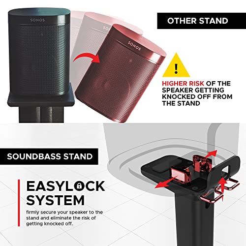 Product Description Soundbass Floor Stand for Sonos One is the perfect complement to your new wireless speaker Soundbass Premier Range The Soundbass Floor Stand supports the speaker, The cable management system tidies away unsightly cables. The height is set at an optimal level for listening comfort and style - 33 inches (820mm) up from the ground makes a real difference when you're sitting down, and there's no need to worry about being forced to have Soundbass branding on your home because there isn't any - even product labels Designed for use with the Sonos One or PLAY:1, these stands are part of the Soundbass Premier collection and are beautifully stylish and will look great in your living space. Perfect Choice For Your Surround Speakers The stands are the perfect choice for your to hold your Sonos One surround speakers for the home cinema along with your playbar, beam or arc. The stands can be paired with any of the other Soundbass Sonos accessories to create a neat and tidy home cinema setup. FEATURES OF OUR PREMIUM SONOS FLOOR STANDS Exclusive Locking System LOCKING SYSTEM Unlike our competitors, our speakers securely lock into the stand using a patented locking system. This eliminates small knocks from children or maybe dogs which often causes speakers to topple. All Hardware Included ACCESSORIES The stands come with rubber feet for hard floors, or adjustable steel spikes for carpeted surfaces. Cables Should Be Hidden CABLE MANAGEMENT The built-in cable management system allows you to hide wires inside stand tubes and cleanly pass them under the stand base. Recover That Space In Your Home SPACE SAVING The shape of the base means that it can perfectly slide under the sofa to give you that all-important space back. Soundbass floor stands are perfect for any room where your Sonos One has been given pride of place. Our stands look beautiful in any situation, especially when matched to the colour of the speaker you own. We have designed them so they can be used just as well on hard floors such as ceramic tiles or laminate floors, or for carpeted surfaces with a carpet spike set. The Soundbass floor stands for Sonos One is the perfect complement to your new wireless speaker. OTHER PERFECTLY MATCH SOUNDBASS SONOS ACCESSORIES TO COMPLETE YOUR SYSTEM Premium Sonos One Floor Stands Premium Sonos One Floor Stand Sonos One Wall Mounts (Tilt & Swivel) Sonos One Wall Mounts (Fixed Angle) Premium Sonos One Wall Mount COLOR AVAILABILITY Black & White Black & White Black & White Black & White Black & White ONE ✓ ✓ ✓ ✓ ✓ ONE SL ✓ ✓ ✓ ✓ ✓ ONE GEN 2 ✓ ✓ ✓ ✓ ✓ PLAY:1 ✓ ✓ ✓ ✓ ✓