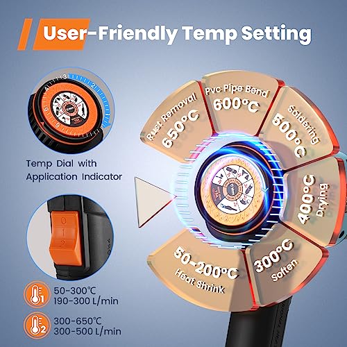• 【7 Heat Modus & 2 Airflow】 – Featuring stepless heat adjustment from 50℃ to 650℃. Exclusive dial design with application icon for quick identify of the right temperature you need! Dual airflow settings (300L/500L) easily cover both delicate work and heavy-duty work.