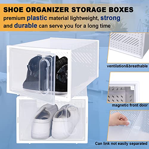 - Clear View: these stackable shoe boxes with clear front door, which has magnetic to prevent the front door from being opened inadvertently, allowing you to easily find what you need without opening the door; The side opening shoe door makes it easier for you to take your shoes and saves your time