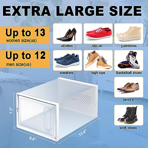 - Extra Large Size: these shoe storage boxes are approx. 13.4'' L x 9.8'' W x 7.3'' H, suitable for women's shoes up to size 14(US) and men's shoes up to size 13(US), and suitable for many types of shoes such as boots, sneakers and high heels, keeping your space away from clutter