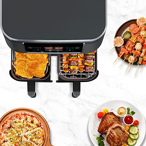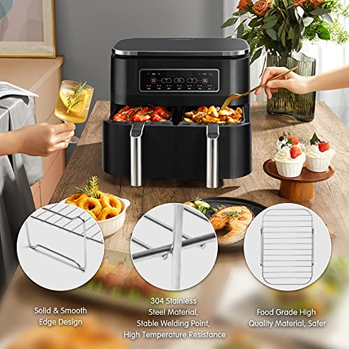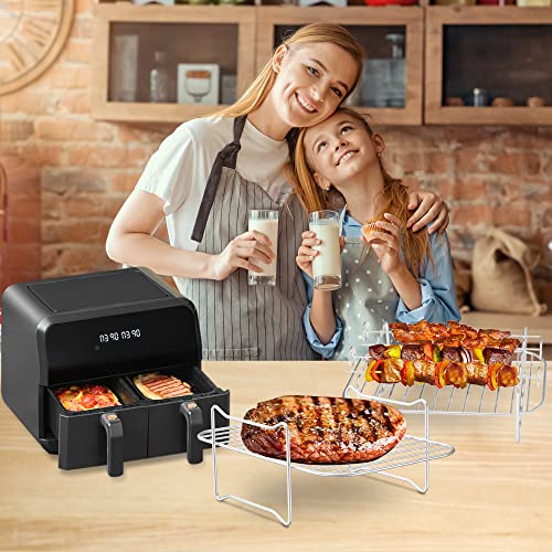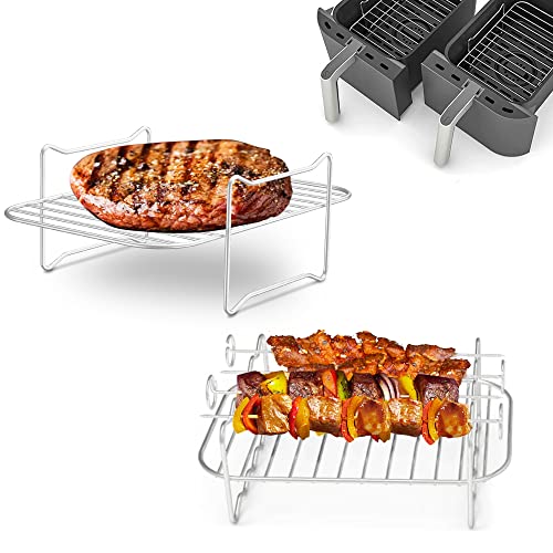 - ✔【Compatibility】This air fryer rack is compatible with all kinds of dual air fryers and can roast all kinds of meat. When using the air fryer stand, place the air fryer basket vertically and push the air fryer basket slowly.