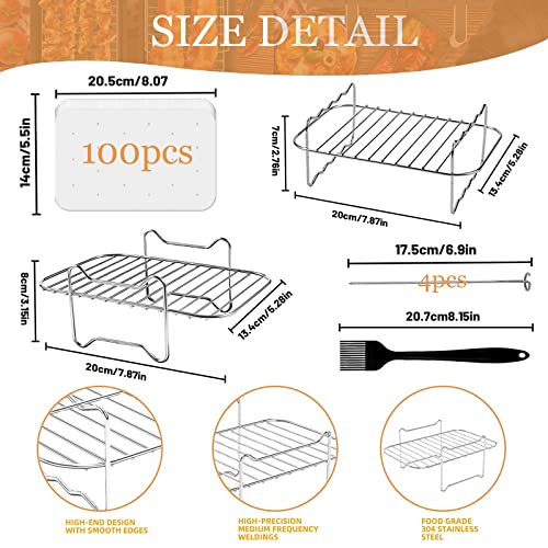 - 🍖【108 Piece Air Fryer Accessories】: 1x Air fryer rack, 1x skewer rack with 4 skewers, 100x Air Fryer Paper Liners, 1x Oil Brush. This air fryer accessories set helps you get the most out of each basket, you can keep it as a thoughtful birthday, holiday gift for friends and family that adds even more convenience and versatility to their air fryer.