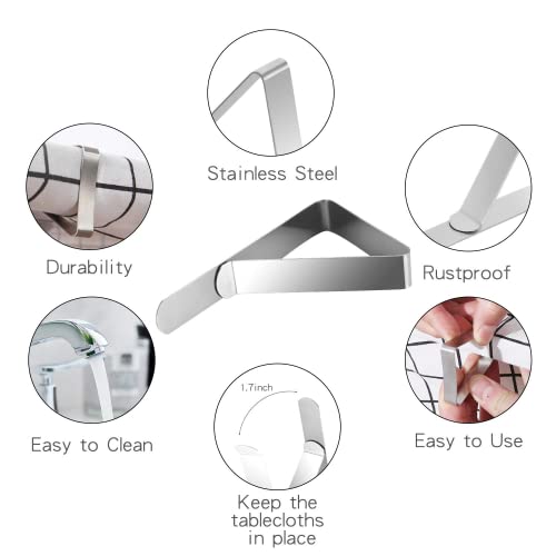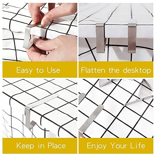 - 【High Quality Material】Tablecloth clips are made of strong and durable stainless steel,durable and rust resistant(great for outdoor dining). Secures tablecloths to most tables,you can use them repeatedly for a long time.