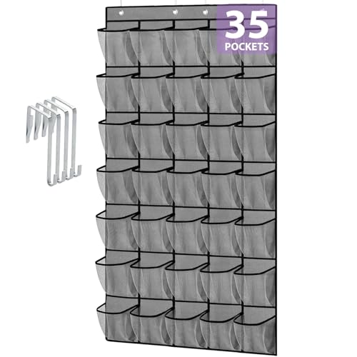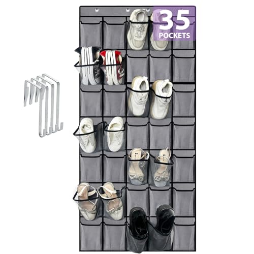 - 👟【35 Large Mesh Pockets for Mens Shoes】: Compared to other over door shoe organizers, this homyfort hanging shoe organizer for closet is bigger size, it measures 67”X26” overall and will come with 35 extra large and deeper mesh pockets, each pocket measures 9.1”H X 5.1”W X 5.5”D, which is breathable and roomy enough to hold 1 pair flat shoes, flip flops, or sandals or 1pc 13 men size shoes in each pocket, so that it can hold up to 35-70 pairs of shoes at least.