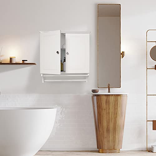 - This bathroom medicine cabinet includes an adjustable shelf design, which can adjust 3 sizes of the inside shelf according to your needs, it can adjust the storage space flexibly. There are 2 metal hangers for you to hang towels, bath towels and other items. Powerful storage makes it easy to find what you need quickly, and it also reduces wasted space and makes your bathroom neat and organized.