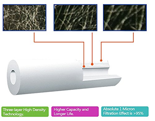 - High quality PP (Polypropylene) 1 micron rated particulate filtration removes levels of rust, dirt, sand and sediment particles larger than 1 microns in size.