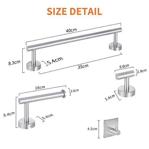- 【Package Includes】- This bathroom hardware set includes 1pcs 16in hand towel bar, 1pcs 6.3in toilet paper holder, 3pcs multifunctional robe hooks,totally 5 pieces.