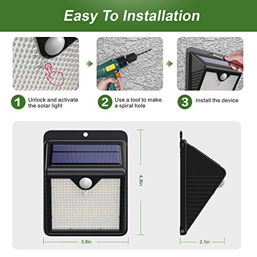 • 【Portable Size & Easy Installation】Solar wall lights are compact and easy to install. No need cables, just use the provided screws and plugs. If you don’t want to punch a hole, you can place it with double-sided tape. The ideal installation height is approximately 2 to 3 meters. Please install the solar lights in the direction of sunlight to get a better charge.