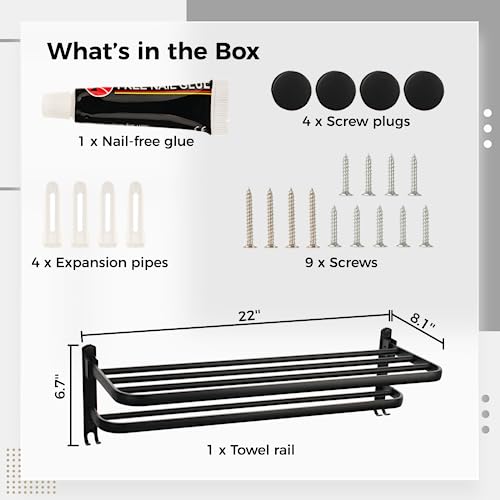 - 【Easy to Install】 This towel rack is easy to install. You can choose to assemble it with screws or with nail-free glue. Both of those two ways are very easy. But before installation, you’d better clean the wall or other smooth surfaces with a wet cloth to remove stains or dust.
