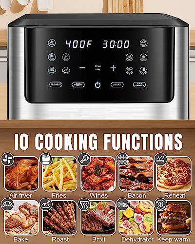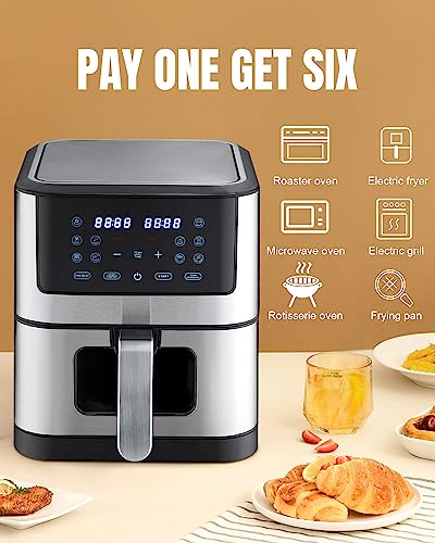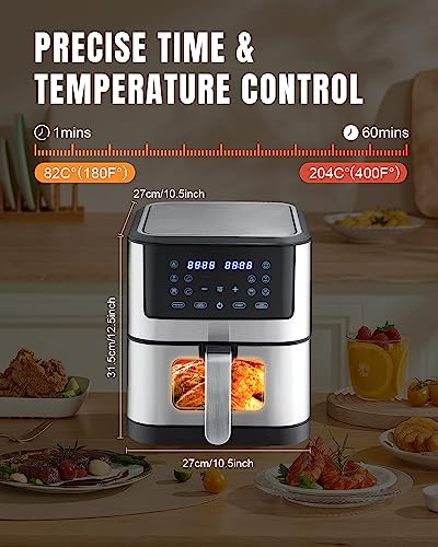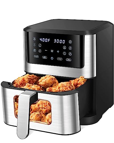 • 🍗Multifunctional Air Fryers: 6.2 QT capacity airfryer equipped with a high-definition touch screen, built-in cooking light, and double-wall insulated viewing windows are designed to be the perfect assistant for your cooking and decoration of your kitchen counter. It is not only an large air fryer with fast air circulation, but also a deep fryer, grill, oven, fryer, toaster, perfect for families who pursue a healthy diet.