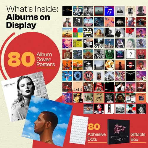 - 🎵 A set of 80 album music poster collage kit. The album cover photos have a matte finish. Each photo is 4x4 square print and comes in a protective box.