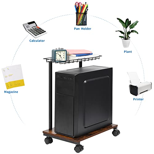 - 【Simple & Practical Design】 The top storage basket can be used for office supplies or small items, open on all sides help to airflow, and the height of the wheels lifts the tower off the ground, speeding up heat dissipation, storing the CPU under or beside your desk, saves desktop space.