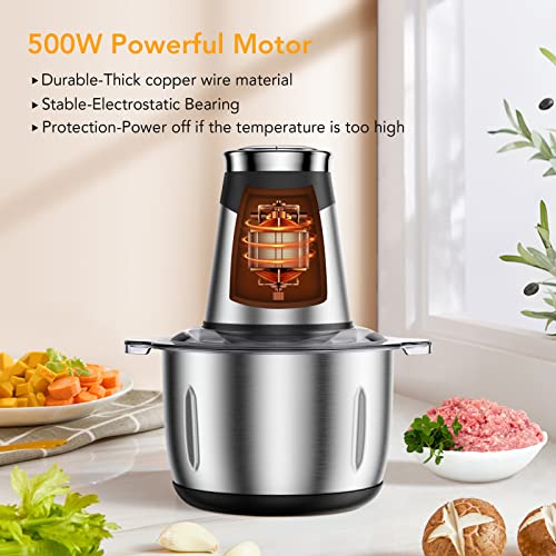 - 【500W and Speed Settings】 The chopper with a powerful 500W pure copper motor, carries 4000 rpm operation, with 4 stainless steel blades 304, you can grind fruits, vegetables, meat , nuts, gravy and even baby food , you save time and effort.