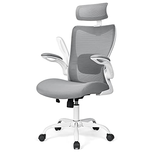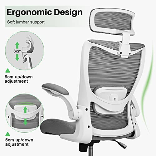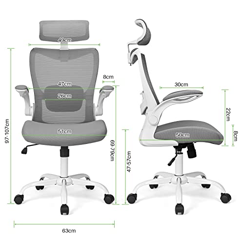- 【5 in 1 Office Chair】The height of the office desk chair can be adjusted within 10cm according to your habbits. With 90°flip-up armrests, 5cm adjustable lumbar support and headrest, 30°tilt rocking, you can enjoy this comfy mesh chair during working, studying and resting.