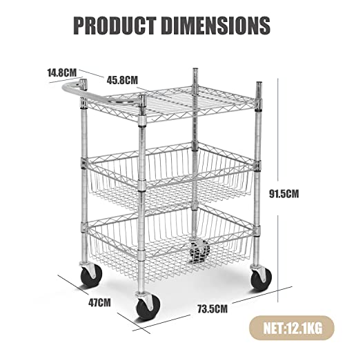 - [Multiple Usage] 3 Tier Height-adjustable metal rack shelf provides space-saving solutions to store tools, drinks, food, vegetable, drinks, toiletries, cosmetics, hairdressing beauty products. It's best partner in kitchens, bathrooms, garages, gardens, or as a bakers rack.