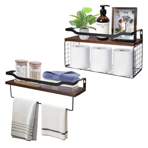 - 【Rustic Shelves With Towel Hanging & Toilet Paper Storage Design】- This above toilet shelves was designed with 2 parts wood shelves,one bathroom shelf comes with a towel hanging rod, it's convinent for stock towel duster cloth drying rack etc.The other shelf was designed with basket to storage bathroom accessories and toilet papers.