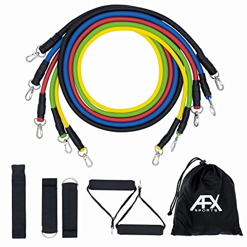 - 11 Piece Resistance Band Set --- Includes 5 different-coloured bands: Black(13.6 kg / 30lbs) > Blue(11.4kg / 25lbs) > Red(9 kg / 20lbs) > Green(7kg / 15lbs) > Yellow(4.5kg / 10lbs), 2 Cushioned Handles, 1 Door Anchor, 2 Ankle Straps and a Carry Bag. The AFX Gym Bands are suitable for men and women