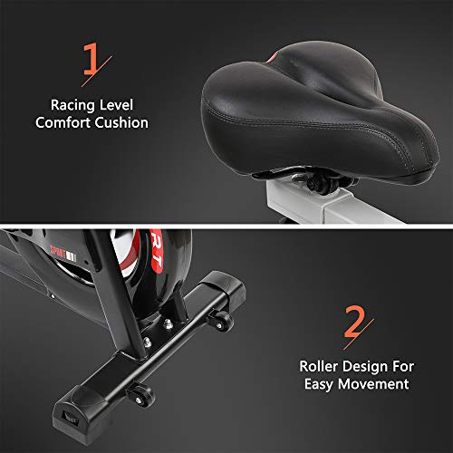 - ?Stable Indoor Bike?Exercise bicycle provides a stable, quiet and safe cycling. Equipped with thickened steel, triangular frame, 13.56lbs flywheel and belt driven system, can support to 265lbs and is smoother than chain. A good choice for home gym.