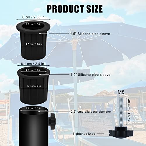 - Easy to Install: Choose different sizes of silicone umbrella accessories according to the diameter of the umbrella, insert the umbrella pole into the base, and then tighten the M8 thread screws to prevent umbrella from slipping off.