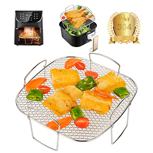 Product Description Air Fryer Rack Square,8 inch Airfryer Rack 304 Stainless Steel Stackable Rack Air Fryer Accessories 304 Stainless Steel Rack For Air Fryer, Compatible With Cosori Air Fryer 5.5L, Proscenic 5.5L, Tefal 6.5L, Cosori 6.4L, Gourmia 6.7L,Air Fryer Oven 10L And More Square Air Fryer Tall Foot Design Can Be Used As Two Tiers To Increase The Capacity Of The Air Fryer, Allowing You To Make More Food At Once Carrying handle design, so you can lift the grill more easily. Special Note: After baking food at high temperatures, please do not lift the grill directly, be sure to wear gloves before lifting to avoid hand burns! Made of high quality 304 stainless steel to maintain the flavor of the food while not producing harmful substances! Transform your kitchen with Hivio innovative products! Sturdy Materia Air Fryer Rack is made of 304 stainless steel, featuring high hardness, wear resistance, high temperature resistance, sturdy and durable. Not easily deformed. It is polished and shiny with good texture Tall Design Tall Foot Design Can Be Used As Two Tiers To Increase The Capacity Of The Air Fryer, Allowing You To Make More Food At Once Strong and Sturdy This air fryer rack square is strong and durable, burr-free, smooth surface will not stick to the pan, high temperature resistance, rust-proof and easy to clean, you can use it with confidence! Handle Design Carrying handle design, so you can lift the grill more easily. Special Note: After baking food at high temperatures, please do not lift the grill directly, be sure to wear gloves before lifting to avoid hand burns! Expand Cooking Area Cooking various foods with your air fryer at same time, save time and energy. There is enough space between trays, ensure smooth air circulation in the air fryer, let the food heated more evenly, and make the food crispy on all sides Easy To Clean Air fryer shelves rack has a smooth surface, no-n-stick, not easy to leave food residues and oil stains. It can be cleaned quickly and easily, dishwasher safe, easy to clean, saving time and effort