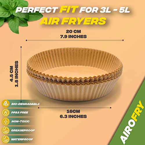 - 🥘【𝗦𝗮𝗳𝗲, 𝗙𝗼𝗼𝗱-𝗚𝗿𝗮𝗱𝗲 𝗠𝗮𝘁𝗲𝗿𝗶𝗮𝗹𝘀】Our AIROFRY air fryer liners are made with natural wood pulp, which is 100% food-grade, non-toxic and safe material! Made with eco-friendly materials, our parchment paper liners are disposable and biodegradable!