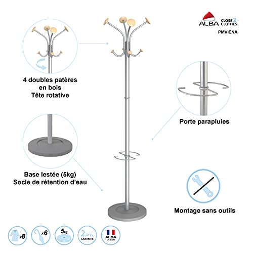 Alba Stily Hat and Coat Stand Tubular Steel with Umbrella Holder 4 Hooks 4 Pegs H1770mm Ref PMVIENA