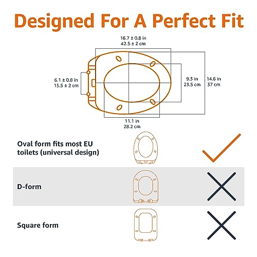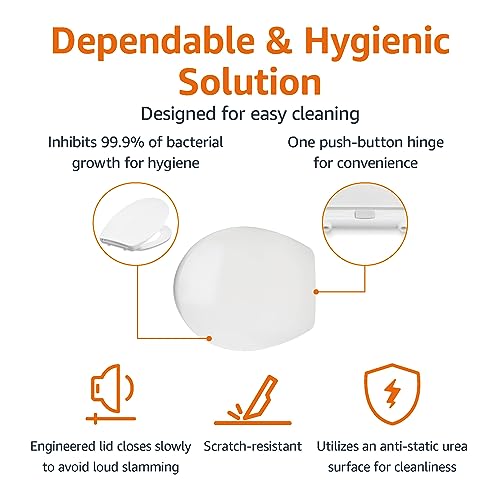 From the manufacturer Toilet seat Sturdy and Scratch-Resistant The high-quality urea material resists scratching and discolouration, so it will stay looking brand-new for longer. Healthy and Hygienic The inherent antibacterial properties prevents harmful germs from multiplying, keeping you and your family safe. Easy Installation The push-button hinge allows the seat to be removed in an instant for cleaning, as well as making it simple to install. Soft Close Say goodbye to noisy toilets slamming in the night, thanks to the automatic soft-close function which gently lowers the lid and seat.