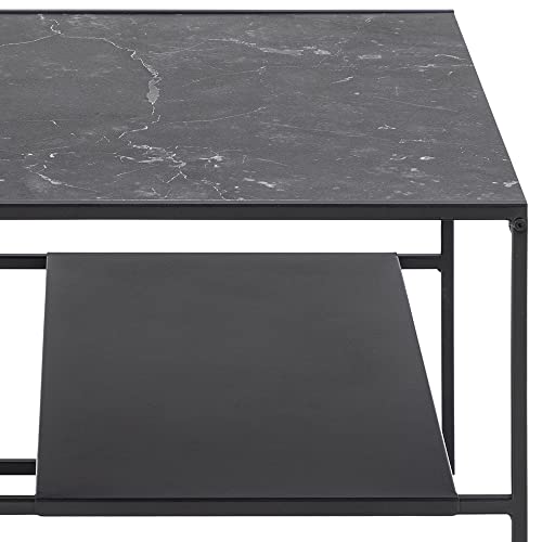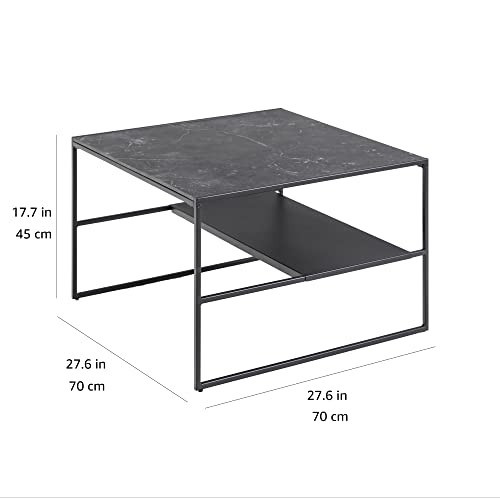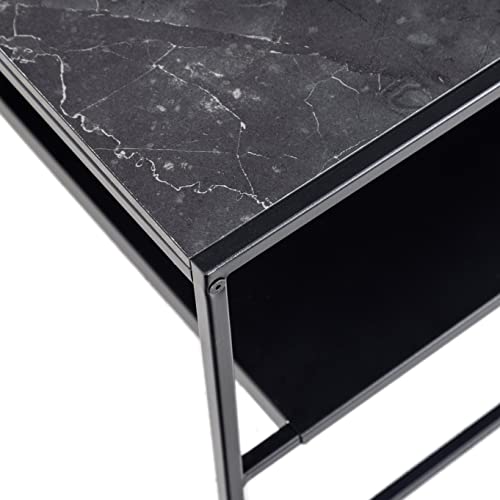 - Material: Textured melamine with black marble print, sturdy metal base with black powder-coated finish