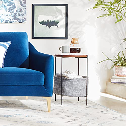 - This clever piece is an all-in-one side table and a great place for guests to park keys and phones. Wood top and narrow legs provide a modern feel, while the cloth basket is handy for storage.