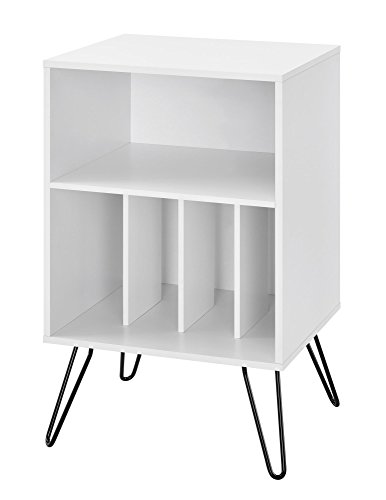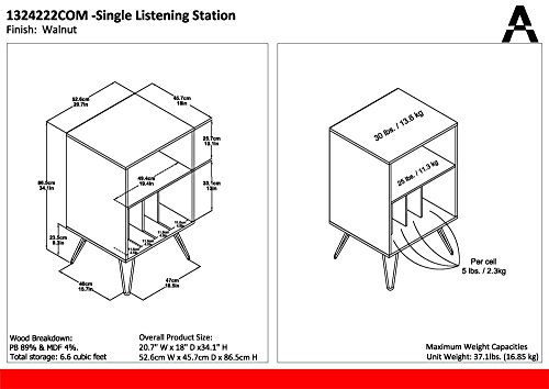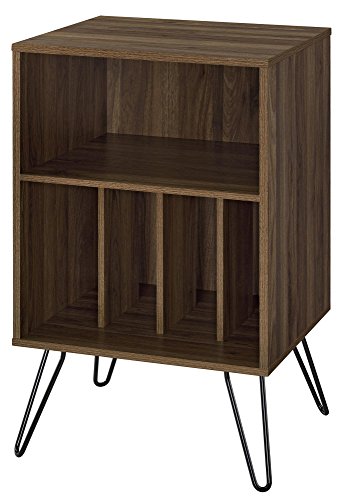 From the manufacturer Novogratz You know the Novogratz family for their bold and eclectic design. Bring that artistic flair home with the Novogratz by Ameriwood Home. Novogratz Concord Turntable Stand with Drawers Add a blast from the past with the Novogratz Concord Turntable Stand with Drawers. Inspired from mid-century design, the laminated particleboard and MDF complement the black metal hairpin legs for a fun retro look. The medium brown woodgrain finish pairs well with any décor from modern to classic. The double wide stand offers plenty of space to place a record player, speakers, and stereo or even decorations. Keep your remotes, cassette tapes, and record mats or weights for your singles stored away and organized in the 2 drawers. Turntable Stand with Storage The drawer cutout gives the stand a clean, no-handle look that is easy to open. Keep all of your albums organized in the large open cubbies that feature metal record dividers to keep all of your albums upright. The Novogratz Concord Turntable Stand with Drawers ships flat to your door and 2 adults are recommended for assembly upon opening. The Stand can hold up to 60 lbs. while the cubbies will hold 20 lbs. each. Each drawer can hold up to 15 lbs. Upon assembly, the Stand measures to be 31.8”H x 39.7”W x 18”D. Novogratz Turntable Stand Single Give your living room or entertainment space a retro look with the Novogratz Concord Turntable Stand. Inspired by mid-century design, the classic medium brown woodgrain laminated particleboard and MDF give the Stand a sturdy build that will last for years while the black metal hairpin legs add a retro twist. The Stand is the perfect size to place your record player and the open cubbies offer plenty of options to keep your albums organized. You can store them upright in the 4 lower cubbies or keep your favorites at the top in the large upper cubby. Novogratz Concord Turntable Stand Dimensions Novogratz Concord Turntable Stand with Drawers Novogratz Concord Turntable Stand with Cubby Novogratz Concord Turntable Stand Formats