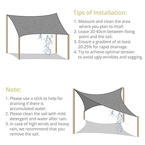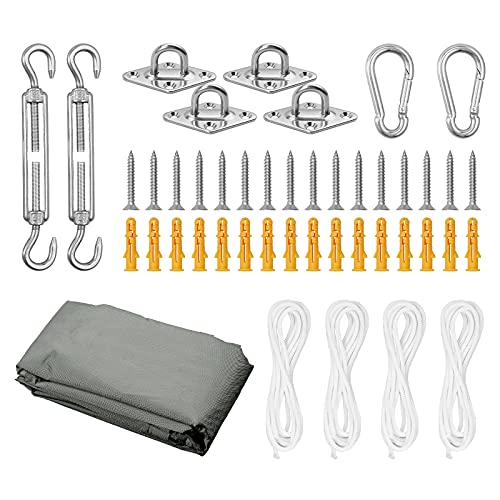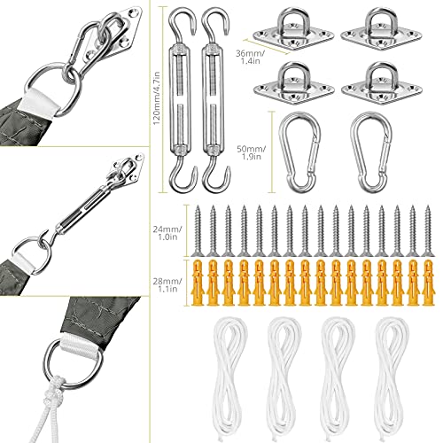 - 【Easy to Use】Installation hardware kits and ropes are all included for this shade cloth. Each corner ends with durable stainless steel D-rings to make the sun sails easily attached to any sturdy connection point, ensuring a firm fit for tear and weather protection.