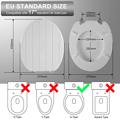 - Adjustable Hinges : Zinc alloy hinge achieve 360-degree rotation, provide maximum adjustment(suits toilet pans with hinge centres between 107 and 203mm), Adjust to your ideal spacing, Measure your toilet bowl to determine if our Toilet Seat is according to your bowl. Our adjustable hinges Toilet Seat fits to all ovel toilets.