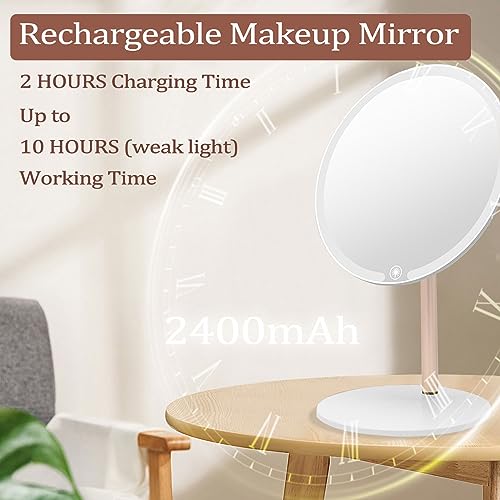 - Rechargeable + Gift 10X Magnified Mirror--The ring light mirror has built-in rechargeable 2 to 10 hours operation 2400mAh lithium battery. Gift 10X magnified makeup mirror allows you to see every detail very clearly to make a perfect makeup for precise facial makeup such as eyelashes, eyebrows, cheeks, etc.