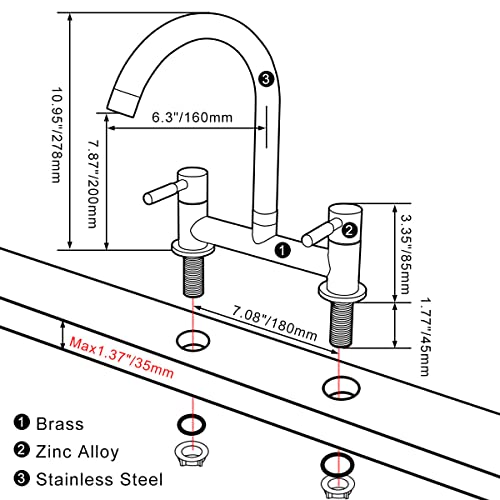 - ❶【TIPS】*Only suit for kitchen sinks with double holes, and the distance between the centers of the double holes is 180 mm. *Our screws are used on the worktop with a max 35 mm thickness, for the hole of a 20 mm diameter. *Please confirm the hole distance of the sink and the thickness of the worktop before purchasing.