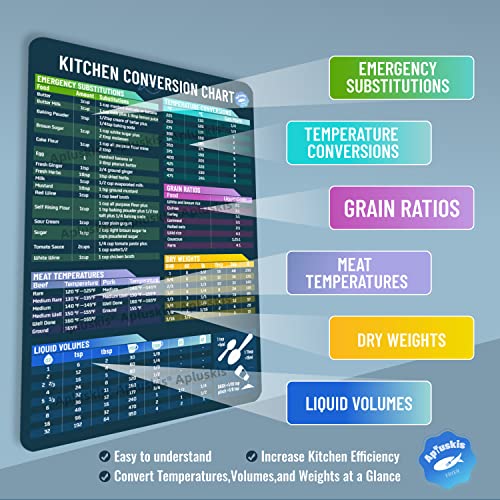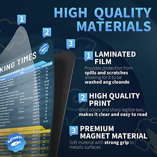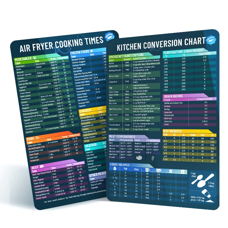 - 🧲 HIGH-QUALITY MAGNET: Our magnetic cheat sheets for air fryers are made using durable materials, magnet firmly attached to the refrigerator or other metal surfaces. Water resistant, strong and easy to clean. This extra large magnetic sheets set include a Air Fryer Cooking Times Guide (10.5 x 6.5") and a Kitchen Measurement Conversion Chart (10.5 x 6.5").