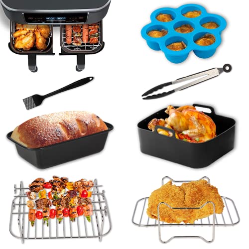 - 【7 Pcs Accessories for Dual Basket Air Fryer】Apluskis Air Fryer Accessories provide all you need for delicious foods, Including 1 x Cake Pan, 1 x Air Fryer Silicone Liners, 1 x Metal Holder, 1 x Multi-purpose Metal Rack with 4 Skewers, 1 x Egg Bites Mold, 1 x Oil Brush and 1 x Food Tong.